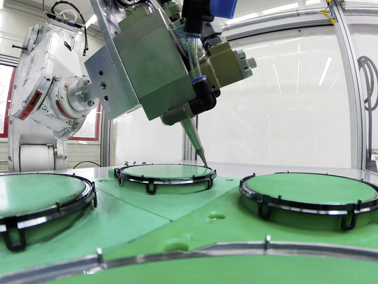 Using specialized dosage and application techniques, under robot-control gaskets and glue beads are applied automated and inline to moulded plastic parts. For sealing plastic lenses in display instruments against dust and for steam-tight and secure three-dimensional gluing of printed sight glasses into medical devices a thermal-curing PU foam is used. Beyond that manifold possible applications are conceivable.